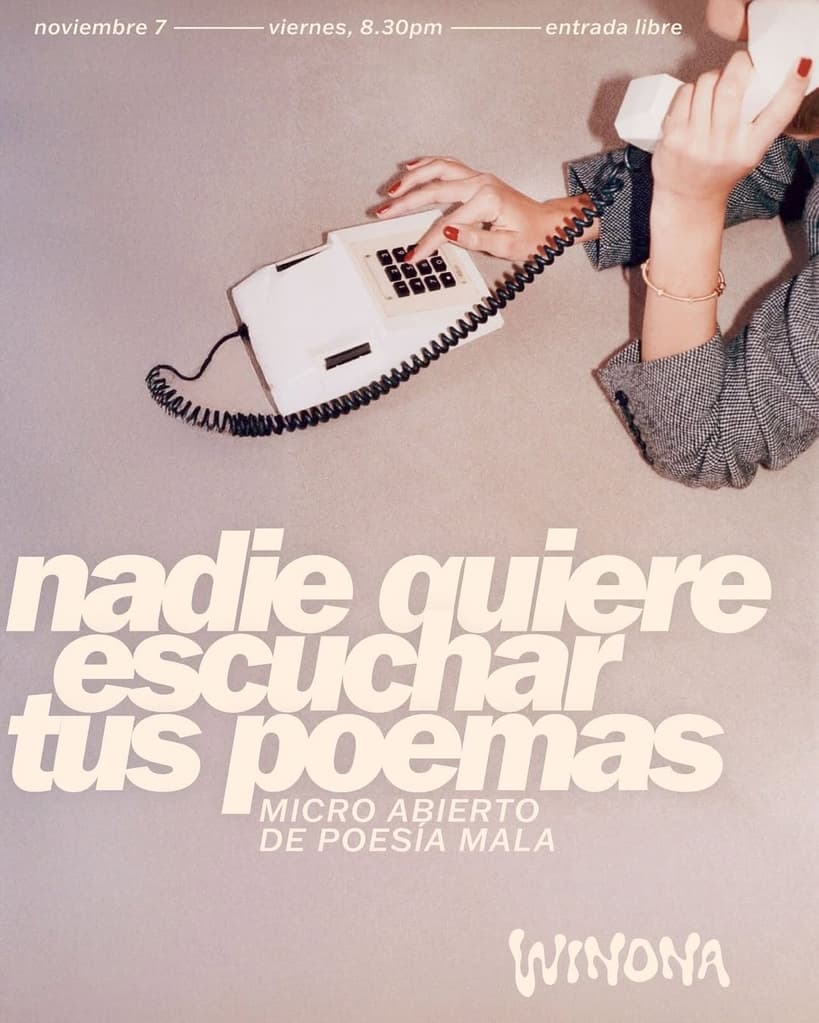 Winona abre el micrófono y las entrañas. Nadie quiere escuchar tus poemas es un open mic para leer lo que normalmente esconderías en tus notas del celular: versos torpes, confesiones mal rimadas o pensamientos que sólo entienden a medianoche.