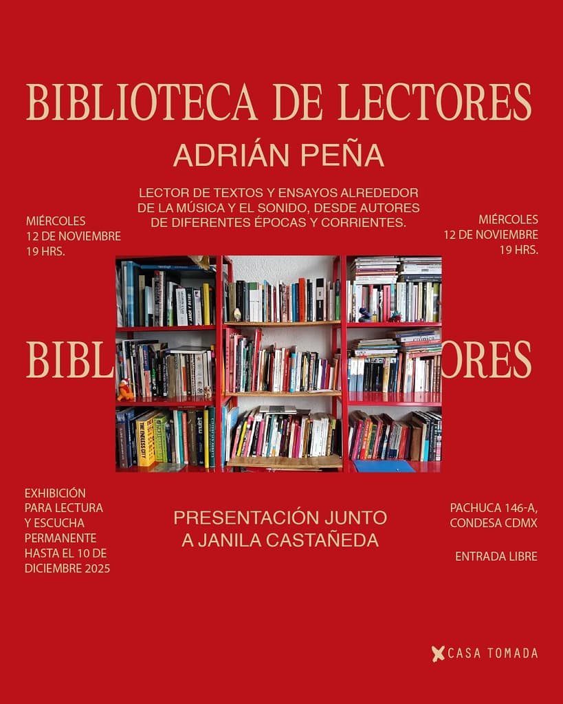 Bajo la idea de que las bibliotecas son demasiado importantes para extender lecturas y conocimiento, Casa Tomada inaugura  una bella sección en la librería donde los lectores podremos  compartir nuestras obsesiones de lectura para que otros lectores nos encuentren. Para inaugurar esto, estará Adrián Peña, Lector de textos y ensayos al rededor de la música y el sonido, desde autores de diferentes épocas y corrientes.