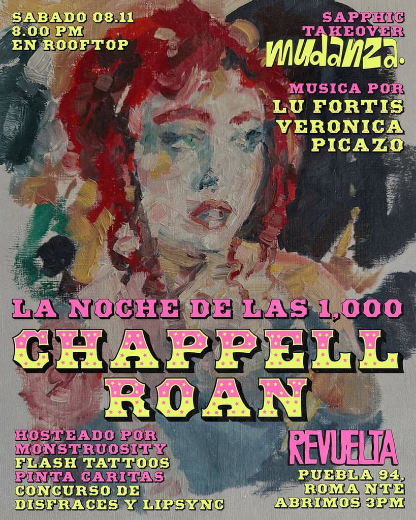Sí, leíste bien: La noche de las 1000 Chappell Roan llega para coronar a la diosa del pop queer en todas sus versiones. Revuelta organiza una fiesta sáfica con hyperpop, flash tattoos, pinta caritas, concursos de disfraces y lipsyncs —así que prepárate para llorar (con The Subway), gritar y bailar como si estuvieras en un video de Chappell.