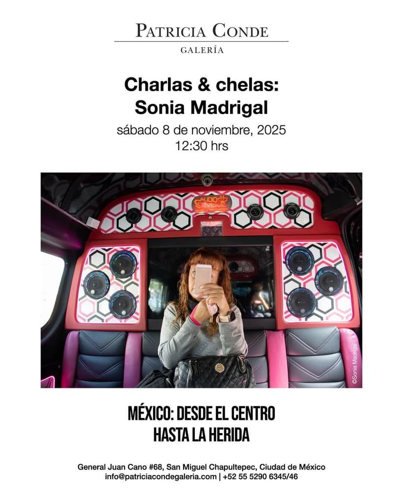 Para cerrar la muestra, la artista Sonia Madrigal compartirá con el público sus reflexiones, procesos e historias en torno a su trabajo y su participación en la exposición. La conversación se desarrollará de pie, sin mesa ni micrófonos, en un ambiente cercano, relajado y sin formalidades que busca romper la distancia entre público y creadora. Charlas y chelas es una invitación a escuchar, preguntar y convivir de manera informal con quienes dan vida a la exposición.