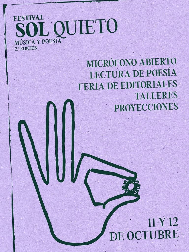 El 11 y 12 de octubre será la celebración de la 2ª edición del Festival Sol Quieto, un encuentro donde la música, la poesía y el arte se entrelazan para abrir un espacio de creatividad, afecto y comunidad. Habrá feria de editoriales, lecturas, talleres y conciertos que conectan voces y propuestas de la Ciudad de México.
