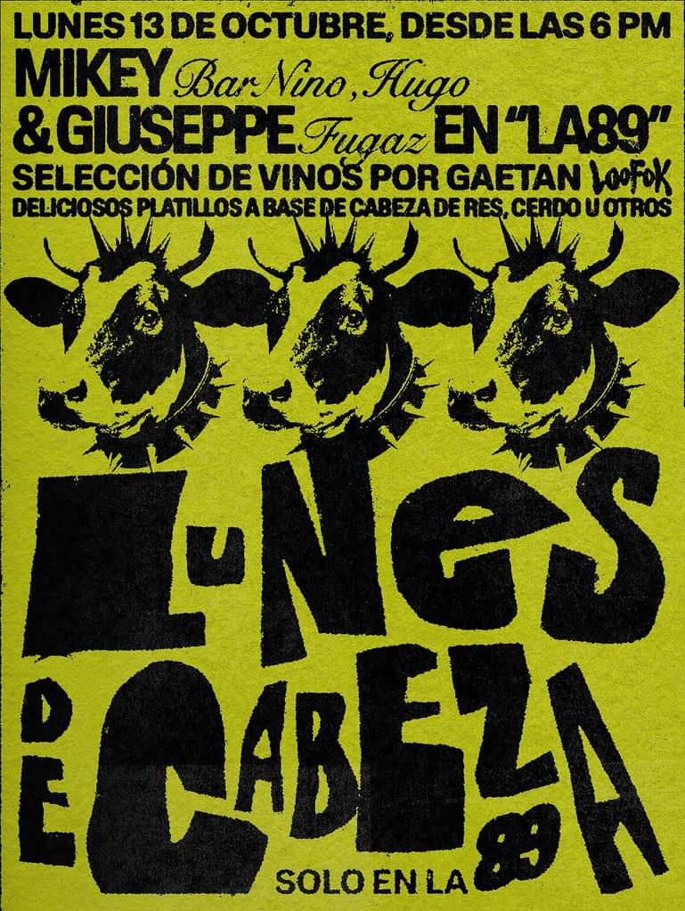 Para este Lunes de Cabeza la 89 se viste de gala con 3 invitados especiales: Mikey de Bar Nino y Hugo, Giuseppe de Fugaz y por supuesto, una deliciosa selección de vinos por Gaetan de Bodega Fantasma. En la cocina, se preparan platillos a base de cabeza de res, cerdo y otras delicias poco comunes.