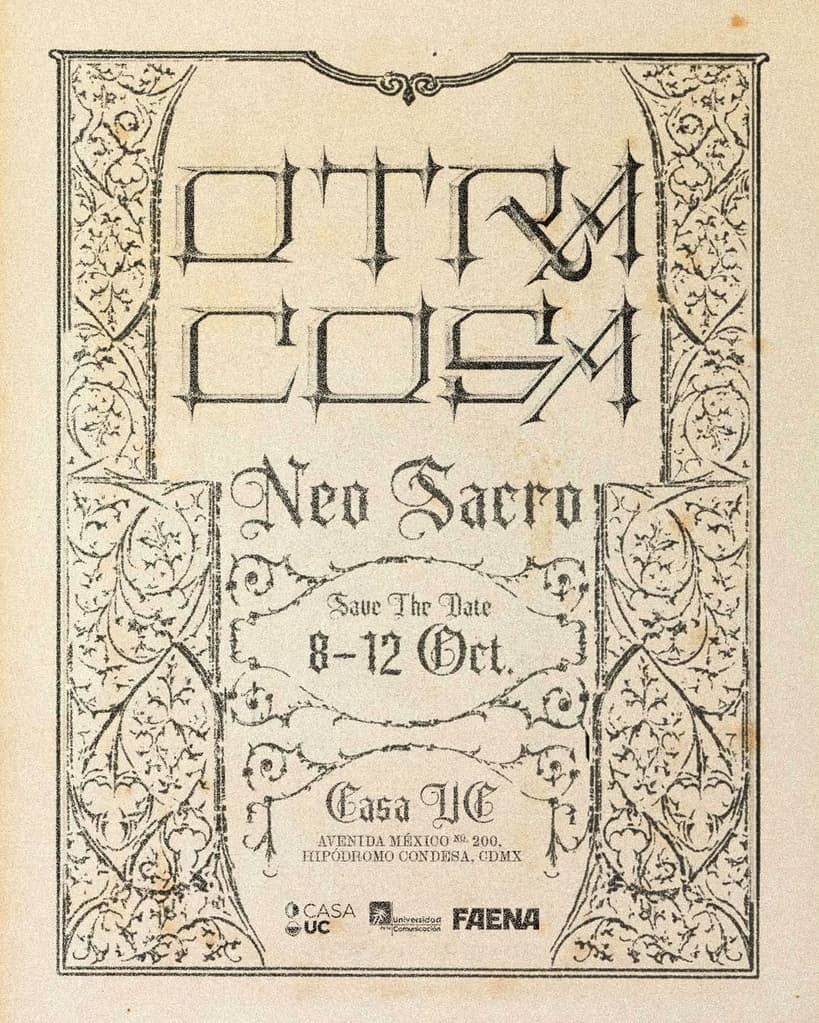 Otra Cosa vuelve este 2025 con el tema Neo Sacro. Este encuentro de arte y objetos contemporáneos vuelve a presentarse por segunda ocasión en paralelo a la semana del diseño en México. La sede es en Casa UC, una construcción de 1930 en el corazón de la condesa.