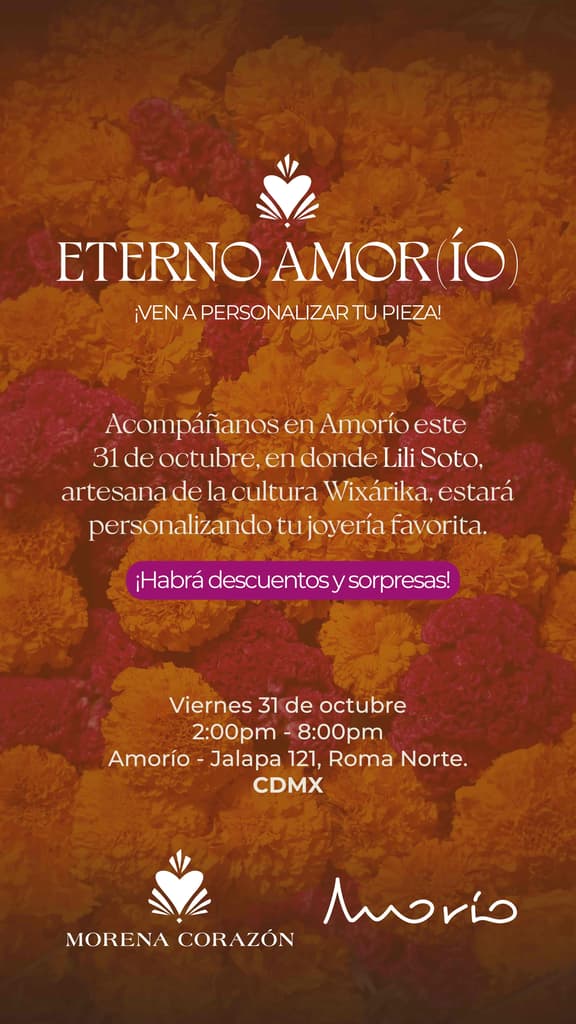 Este viernes 31 de octubre, Morena Corazón y Amorío celebran el espíritu del Día de Muertos con Eterno Amor(ÍO) —una experiencia de personalización de joyería a cargo de Lili Soto, artesana Wixárika.