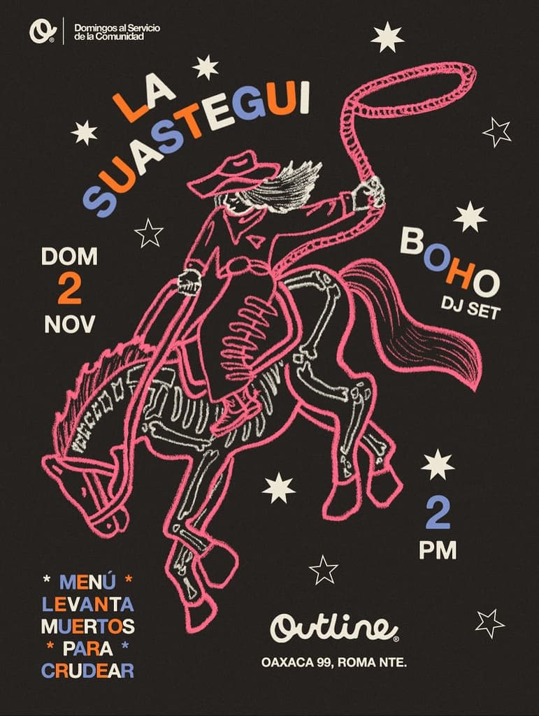 Para crudear y levantar al muerto después de este fin de semana de mucha fiesta, La Suastegui estará creando un menú que te regresará a la vida, mientras que Boho pondrá el ritmo.