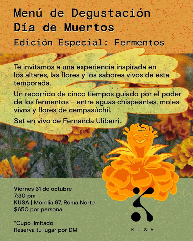 Este 31 de octubre Kusa te invita a una experiencia inspirada en los altares, las flores y los sabores vivos de la temporada. Un recorrido de cinco tiempos guiado por el poder de los fermentos —entre aguas chispeantes, moles vivos y flores de cempasúchil.