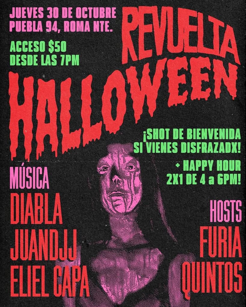 Por supuesto que Revuelta tendrá una de las mejores fiestas de Halloween del fin de semana. La música estará a cargo por la Diabla, Juandjj y Eliel Capa. Lo mejor, shot de bienvenida si vas disfrazadx y 2×1 en drinks de 4 a 6pm.