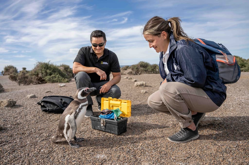Los conservacionistas Pablo Borboroglu y Candela Tisera Manochio, de la Global Penguin Society, saludan a un pingüino de Magallanes mientras registran distintas mediciones. La Estancia San Lorenzo, en la Península Valdés de Argentina, alberga la colonia de pingüinos de Magallanes más grande del mundo. ©Luján Agusti/National Geographic