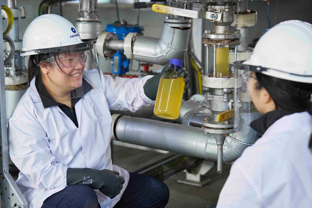 Las cofundadoras de Novoloop, Jeanny Yao (izquierda) y Miranda Wang, usan cascos y visores protectores mientras inspeccionan una muestra de monómeros. ©Rolex/Greg White.
