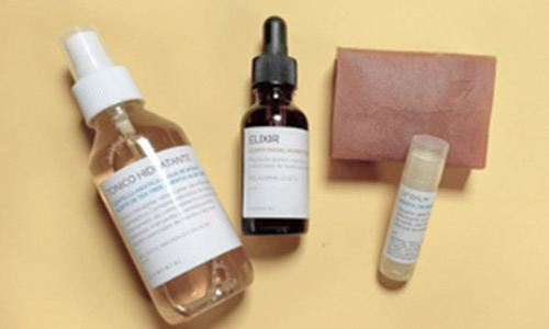 Productos de cuidado persoal ecológicos: shampoo en barra, jabón, desodorante, mascarillas, tónicos faciales, aceite corporal. Todo está hecho a mano con métodos artesanales.