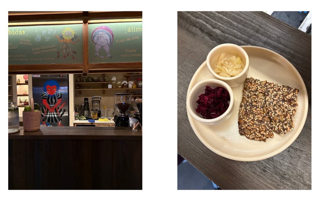 Me siento a probar un Elixir Corazón y un Batido Antigripal que acompañé con un toast verde: pan de masa padre con pesto casero de albahaca, corazones de alcachofa, jocoque artesanal, brotes de amaranto y jitomate cherry. Las sopas, los puddings de chía, los panqués y galletas también siguen esa misma filosofía: nutrir, dar energía real y cuidar tu microbiota, todo con honestidad y sabor.