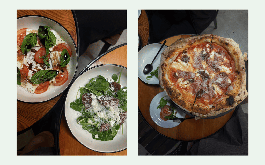 El lugar también tiene un ritmo propio. Mientras algunos llegan en pareja buscando una cena tranquila, otros vienen en grupo, compartiendo varias pizzas, riendo y dejando que la conversación fluya al ritmo del horno. Afuera, la Juárez sigue con su tránsito habitual, pero dentro se siente un respiro, un espacio donde el tiempo parece suavizarse y donde comer se vuelve un acto de disfrute y pausa.