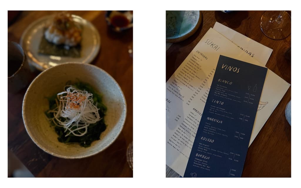 En Sukai hay varios espacios que cambian la experiencia, siempre para bien: en la barra uno puede sentarse a observar cómo se prepara cada platillo, el salón principal es perfecto para dates o una charla profunda entre amigos y en la terraza es inevitable escuchar a familias enteras disfrutar de un domingo soleado. En el interior, la madera hace que el lugar se sienta más cozy que otros. Además, la iluminación juega un rol central en Sukai: una lámpara circular con una tenue luz cálida capta la atención incluso de los que caminan por ahí. Se trata de un ambiente acogedor, cómodo, como si nos dejáramos envolver por una atmósfera que invita no sólo a la desconexión sino al asombro, a las risas y al cariño a la comida.